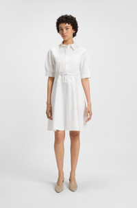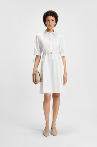 SIZE AND FIT The model wears a size 4 and is 5'10" tall with a, 31" chest, 24" waist and 35" hips. DETAILS Delaurena - 50537388 Featuring modern seaming, this BOSS Womenswear dress is a fresh take on a classic. Crafted in twill made from cotton blended with stretch, this dress has a buckled belt and half placket for a creative effect. A point collar completes this piece. This product is partly made with . Our standards do not allow the use of synthetic fertilizers, pesticides or genetically modified seeds. Fit back length: 95 cm (37 inches) QUALITY & CARE INSTRUCTIONS Do Not Wash Do Not Bleach Quality: 96% Cotton, 4% Elastane, pocketing: 64% Viscose, 36% Polyester Reduced Dry Clean Iron Low Heat Do Not Tumble Dry