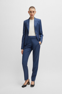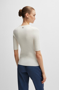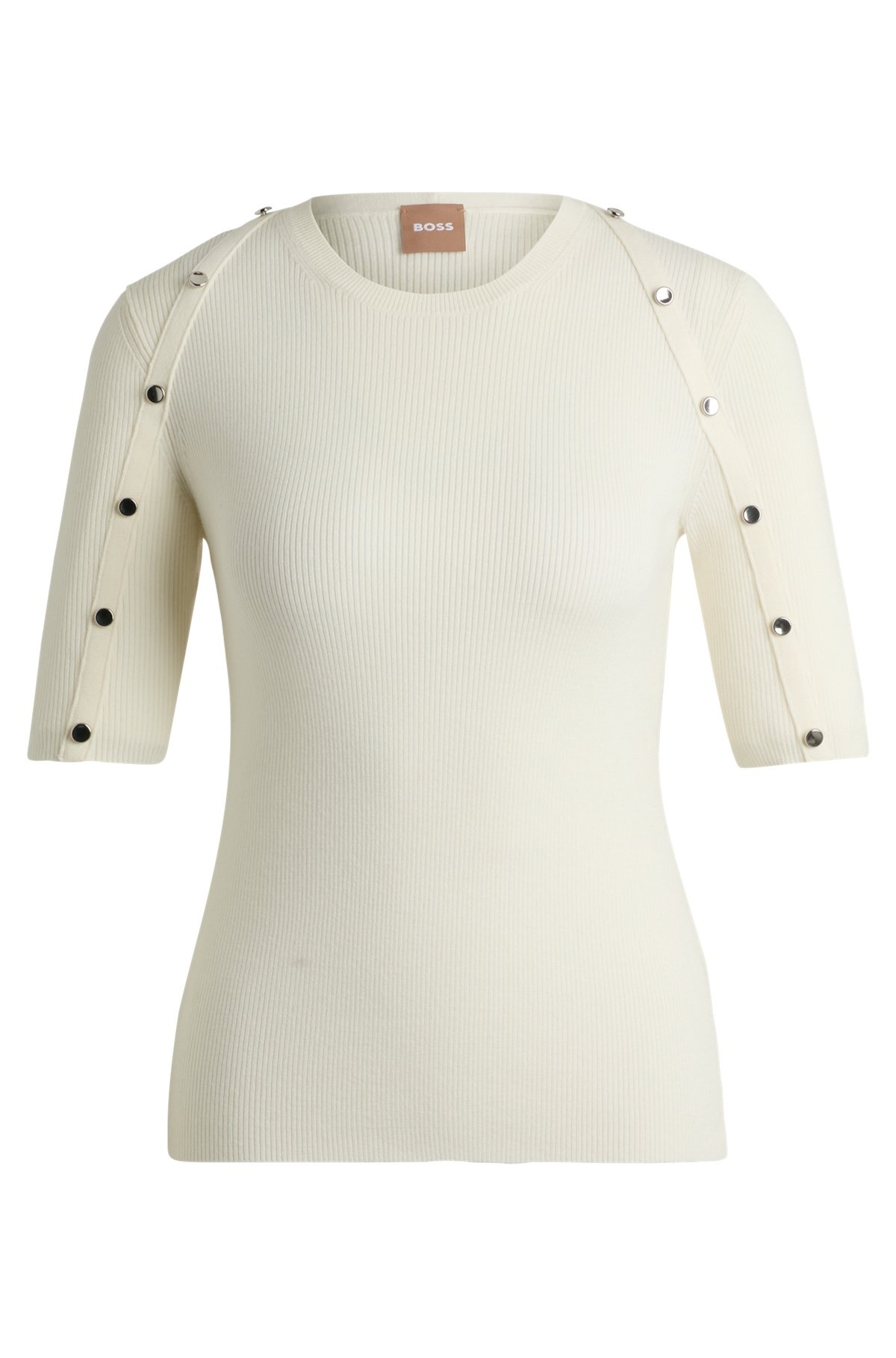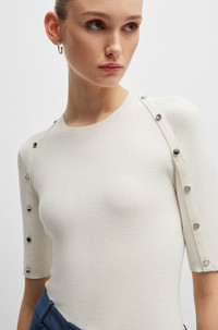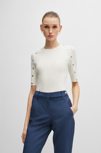 SIZE AND FIT The model wears a size S and is 5'10" tall with a, 29" chest, 24" waist and 35" hips. DETAILS Famistosa - 50493911 A short-sleeved ribbed sweater by BOSS Womenswear, blended with wool and stretch and trimmed with hardware buttons for a distinctive look. Neckline: Crew neck Short sleeves QUALITY & CARE INSTRUCTIONS Reduced Dry Clean Iron Low Heat Do Not Tumble Dry Hand Wash Only Quality: 39% Wool, 39% Polyacrylic, 19% Polyamid, 3% Elastane Do Not Bleach