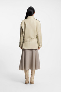 SIZE AND FIT The model wears a size 4 and is 5'9" tall with a, 31" chest, 23" waist and 35" hips. DETAILS Crafted in buttery-soft nappa leather with a removable belt, this cleanly styled BOSS Womenswear coat updates the classic trench. Relaxed fit Asymmetric chest pocket. Relaxed fit Point collar Fastening top: Belted closure Number of buttons: 4 or more buttons Flap chest pockets Pockets top: Side-entry pockets Belted cuffs Short length Fit back length: 73 cm (29 inches) Satila - 50554146 QUALITY & CARE INSTRUCTIONS Material: 100% materialcode.SL, Lining: 55% Polyester, 45% Viscose Do Not Bleach Do Not Tumble Dry Do Not Wash Do Not Iron Reduced Dry Clean