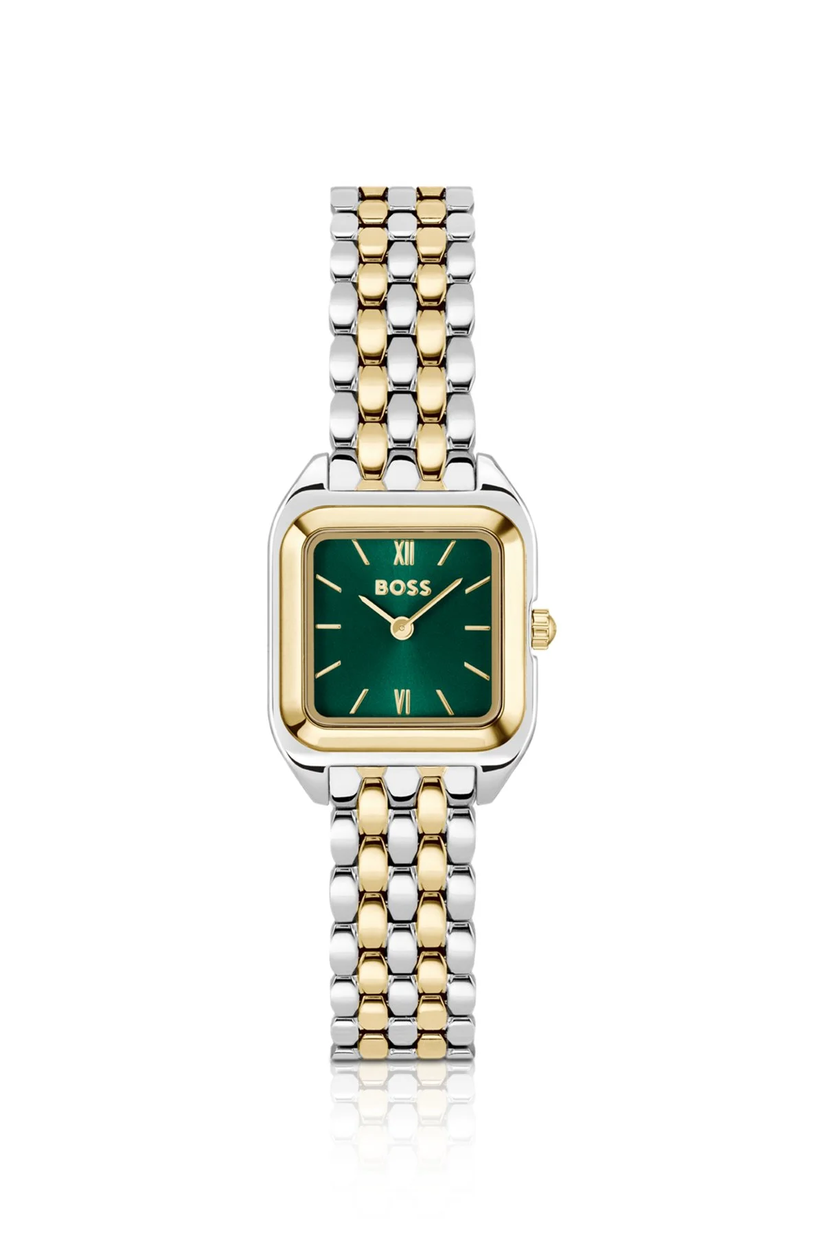 DETAILS With its subtle square case and green sunray-brushed dial, this BOSS Womenswear watch adds elegance to any look. Delicately crafted two-tone bracelet. Watch mechanism: Two-hand Dial color: green Strap material: Stainless steel Closure: Foldover buckle Water Resistance (in ATM): 3 ATM MAE PETITE - 58565054 QUALITY & CARE INSTRUCTIONS Material: 100% Stainless steel
