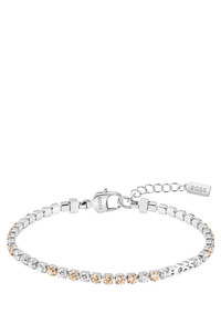 DETAILS KASSY PRECIOUS - HB1580633 Trimmed with sparkling crystals in clear and champagne effects, this tennis bracelet by BOSS Jewelry is something truly special. Adjustable extender. Integrated logo lettering. Length: 16cm (with extender) QUALITY & CARE INSTRUCTIONS Quality: 100% Stainless steel