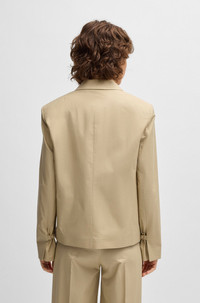 SIZE AND FIT The model wears a size 4 and is 5'9" tall with a, 31" chest, 24" waist and 35" hips. DETAILS Jupan - 50537453 This BOSS Womenswear blazer is simply detailed and ideal paired with the matching trousers for summer tailoring. Made in breathable cotton with stretch for comfort. Fit back length: 61 cm (24 inches) QUALITY & CARE INSTRUCTIONS Iron Low Heat Do Not Wash Quality: 97% Cotton, 3% Elastane, Lining: 55% Polyester, 45% Viscose Reduced Dry Clean Do Not Bleach Do Not Tumble Dry