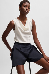 SIZE AND FIT The model wears a size 4 and is 5'10" tall with a, 31" chest, 24" waist and 35" hips. DETAILS Belidina - 50537652 Crafted in a drapey blend of stretch silk, this BOSS Womenswear blouse is a versatile underpinning. Cowl neckline and sleeveless styling. Sleeveless QUALITY & CARE INSTRUCTIONS Do Not Wash Do Not Tumble Dry Iron Low Heat Do Not Bleach Quality: 90% Silk, 10% Elastane Reduced Dry Clean