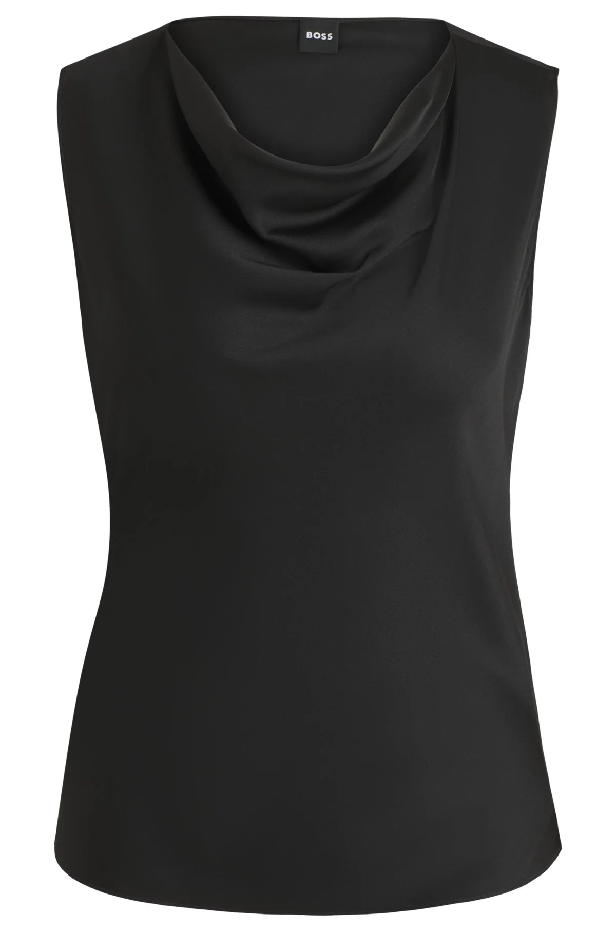 DETAILS Belidina - 50537652 Crafted in a drapey blend of stretch silk, this BOSS Womenswear blouse is a versatile underpinning. Cowl neckline and sleeveless styling. Sleeveless QUALITY & CARE INSTRUCTIONS Do Not Wash Do Not Bleach Do Not Tumble Dry Reduced Dry Clean Quality: 90% Silk, 10% Elastane Iron Low Heat