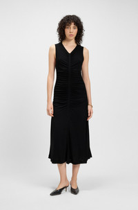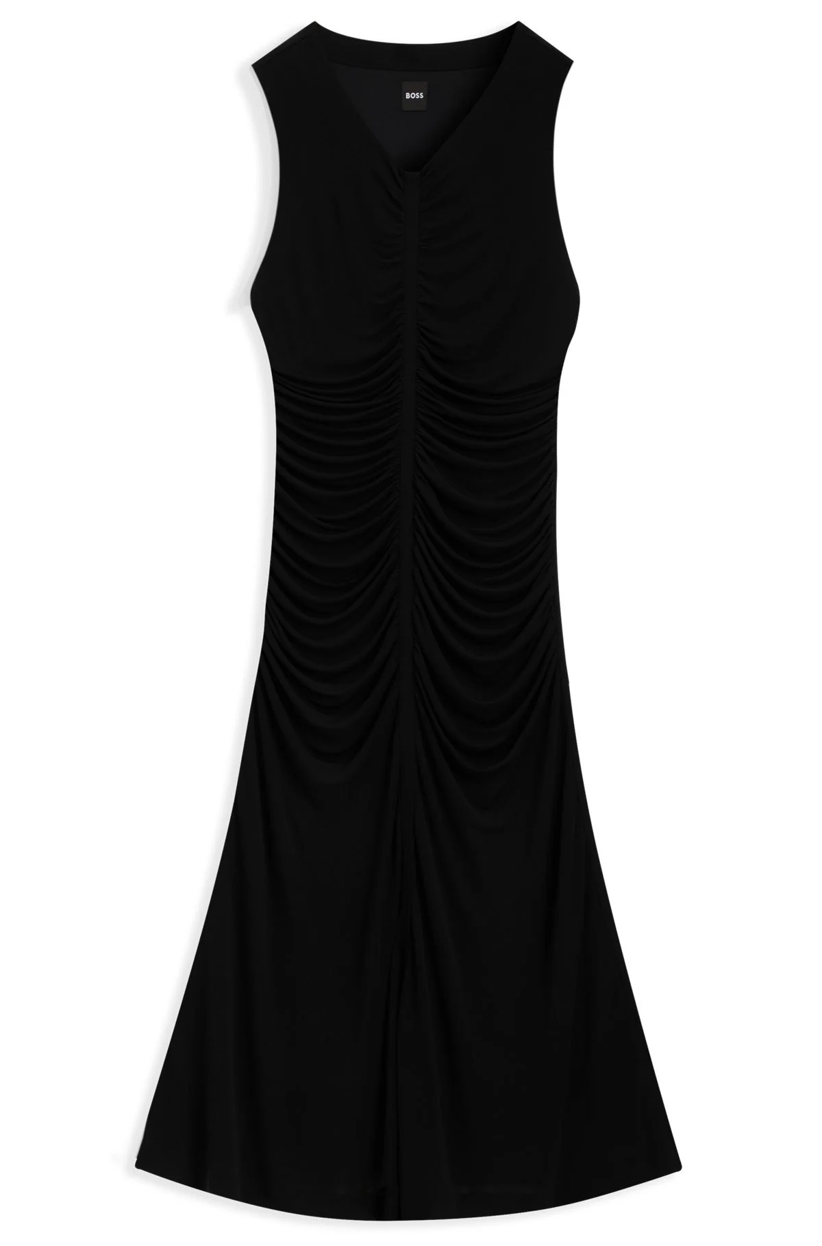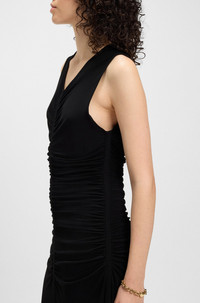 SIZE AND FIT The model wears a size S and is 5'10" tall with a, 31" chest, 24" waist and 34" hips. DETAILS Elamo - 50543454 Combining draping and gathering, this BOSS Womenswear dress creates a flattering effect with easy movement. Crafted in soft jersey with a matte texture. Slim fit Neckline: V-neck Sleeveless QUALITY & CARE INSTRUCTIONS Do Not Tumble Dry Quality: 100% Viscose, Lining: 86% Polyamid, 14% Elastane Reduced Dry Clean Hand Wash Only Iron Low Heat Do Not Bleach
