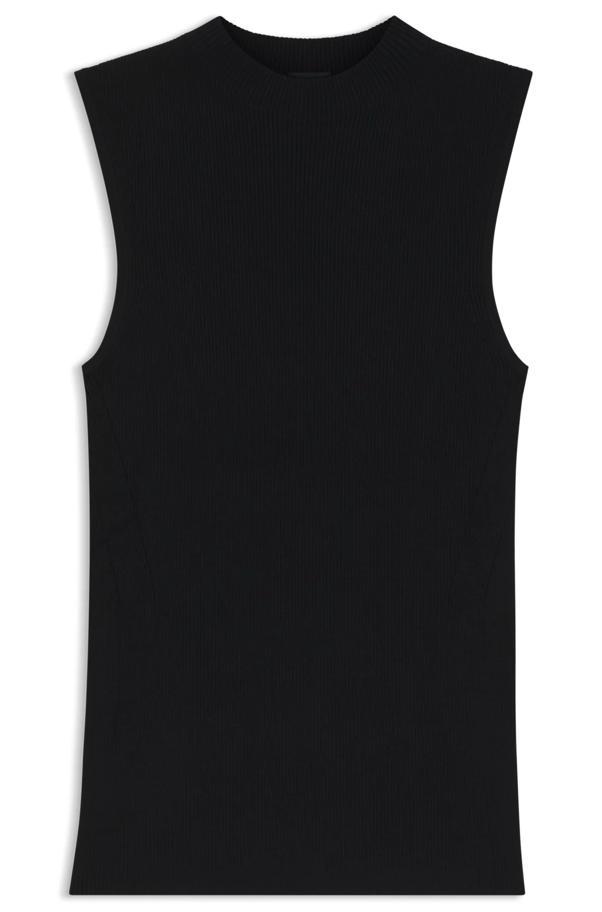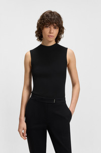SIZE AND FIT The model wears a size S and is 5'9" tall with a, 31" chest, 24" waist and 35" hips. DETAILS Feskies - 50473237 This ribbed BOSS Womenswear top combines sophistication with effortless style for any occasion. Crafted in breathable, shape-retaining fabric. Chic mock neckline. Slim fit Neckline: Mock Neck Sleeveless Fit back length: 60 cm (24 inches) QUALITY & CARE INSTRUCTIONS Iron Low Heat Quality: 76% Viscose, 24% Polyamid Dry Clean Only Hand Wash Only Do Not Bleach Do Not Tumble Dry