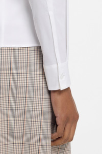 SIZE AND FIT The model wears a size 2 and is 5'8" tall with a, 30" chest, 23" waist and 35" hips. DETAILS Bashinah - 50499433 A super-soft blouse by BOSS. This piece is tailored to a defined fit with a concealed closure. This product is partly made with cotton. Our standards do not allow the use of synthetic fertilizers, pesticides or genetically modified seeds. Slim fit Point collar Fastening top: Zip closure Long sleeves Button cuffs Fit back length: 60 cm (24 inches) QUALITY & CARE INSTRUCTIONS Machine Wash Cold Gentle Do Not Tumble Dry Iron Low Heat Do Not Bleach Reduced Dry Clean Quality: 72% Cotton, 28% Elastomultiester