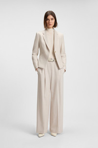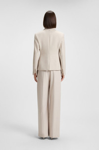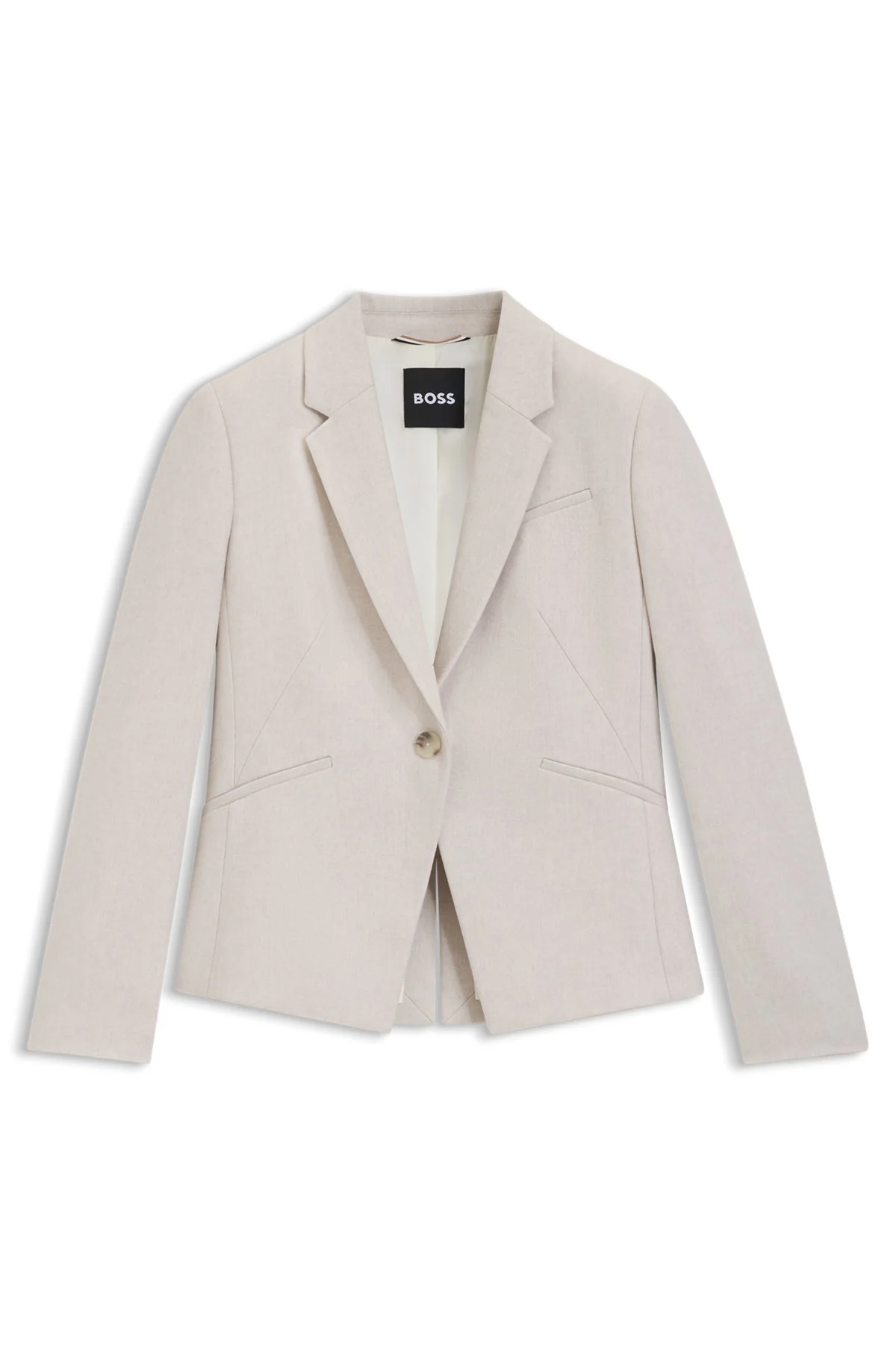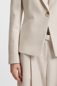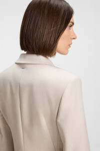 DETAILS With a slim cut in wintry flannel, this BOSS Womenswear blazer is so easy to style with the matching trousers. Blended with wool. Slit cuffs. Slim fit Notched lapels Fastening top: Button closure Number of buttons: 1 Welt chest pockets Pockets top: Welt pockets Slit cuffs Fully lined Fit back length: 62 cm (24 inches) Jia9 - 50548754 QUALITY & CARE INSTRUCTIONS Do Not Tumble Dry Iron Low Heat Do Not Wash Do Not Bleach Quality: 44% Wool, 35% Lyocell, 21% Polyamid, Lining: 64% Viscose, 36% Polyester Reduced Dry Clean