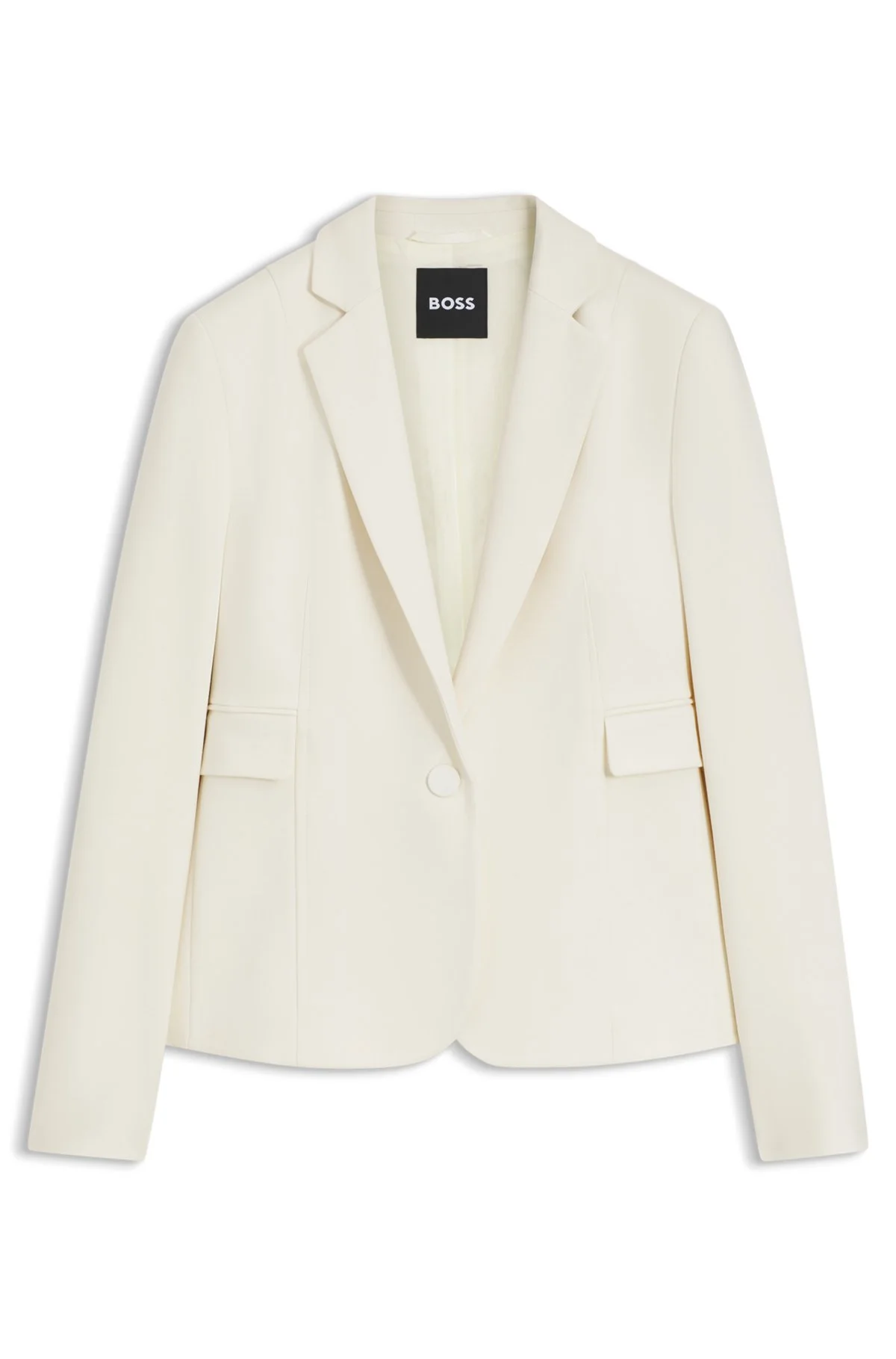SIZE AND FIT Slim fit The model wears a size 2 and is 5'9" tall with a, 30" chest, 23" waist and 35" hips. DETAILS Cut to a slim fit with darts for a flattering profile, this BOSS Womenswear blazer is crafted in stretch fabric. Single-button closure. Signature trims. Slim fit Notched lapels Fastening top: Button closure Number of buttons: 1 Pockets top: Flap pockets Fully lined Jia14 - 50556336 QUALITY & CARE INSTRUCTIONS Iron Low Heat Do Not Tumble Dry Reduced Dry Clean Do Not Bleach Do Not Wash Material: 65% Viscose, 30% Polyamide, 5% Elastane, Lining: 64% Viscose, 36% Polyester