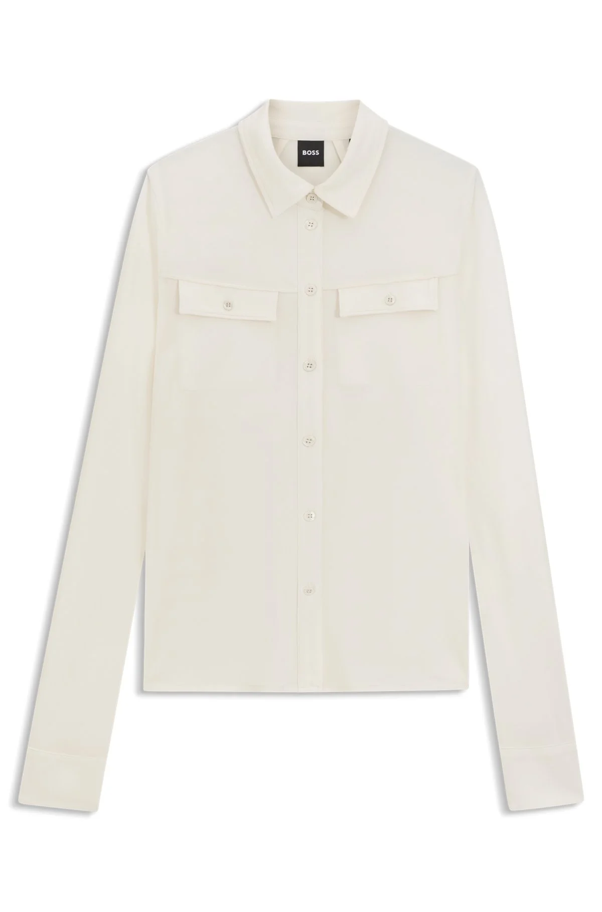 SIZE AND FIT The model wears a size S and is 5'10" tall with a, 31" chest, 24" waist and 35" hips. DETAILS Elasha - 50541895 Create a variety of day-to-evening looks with this BOSS Womenswear blouse. Cut to a slim fit in soft jersey with a matte finish. Slim fit Long sleeves Slit cuffs Flap chest pockets QUALITY & CARE INSTRUCTIONS Do Not Tumble Dry Reduced Dry Clean Hand Wash Only Quality: 100% Viscose Iron Low Heat Do Not Bleach