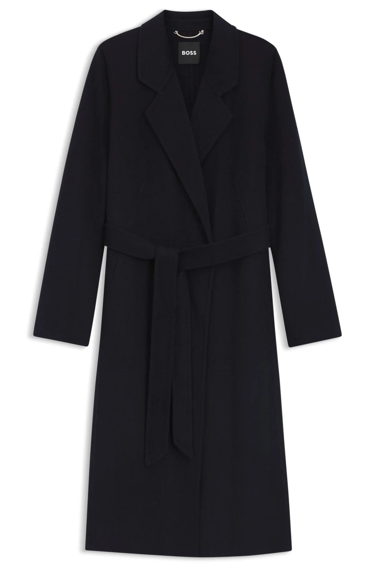 DETAILS With a minimalist belted closure, this slim-cut BOSS Womenswear coat is great for throwing over everyday looks. Wool-rich double-faced fabric. Notch lapels Slim fit Notched lapels Fastening top: Belted closure Number of buttons: Open front Pockets top: Side-entry pockets Back vent Unlined Long length Fit back length: 115 cm (45 inches) Cotaz_DF - 50548066 QUALITY & CARE INSTRUCTIONS Iron Low Heat Quality: 80% Wool, 20% Polyamid, pocketing: 100% Polyester Do Not Tumble Dry Reduced Dry Clean Do Not Bleach Do Not Wash