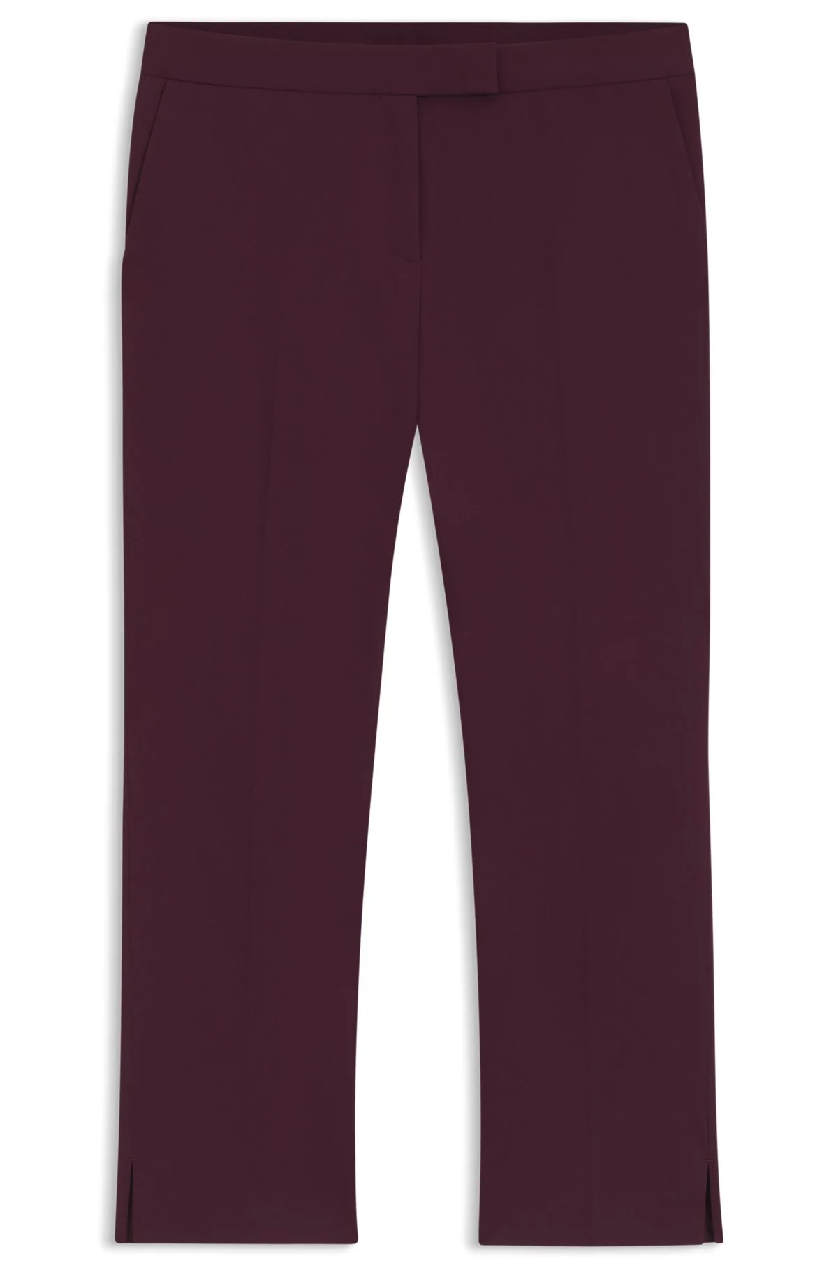 DETAILS Tapria-Crop1 - 50545323 A versatile building block, these BOSS Womenswear trousers are cut to a clean fit with a cropped length. Comfortable stretch cotton. Slim fit Regular rise Hook and zip closure Slim leg Crease Pockets bottom front: French pocket Pockets bottom back: Welt pocket Fit foot width: 35,0 cm (13.8 inches) QUALITY & CARE INSTRUCTIONS Reduced Dry Clean Machine Wash Cold Gentle Do Not Tumble Dry Quality: 97% Cotton, 3% Elastane, pocketing: 55% Polyester, 45% Viscose Do Not Bleach Iron Low Heat