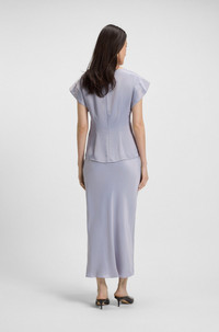 DETAILS Bavati - 50541815 Crafted in glossy satin for an elegant look, this BOSS Womenswear blouse has a modern draped neckline. Cut to a contemporary slim fit. Short sleeves. Slim fit Club collar Fastening top: Zip closure Short sleeves Fit back length: 62 cm (24 inches) QUALITY & CARE INSTRUCTIONS Do Not Bleach Iron Low Heat Reduced Dry Clean Cold, gentle machine wash; reduced spin speed. Do Not Tumble Dry Quality: 100% Viscose, Insert: 100% Viscose