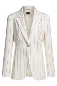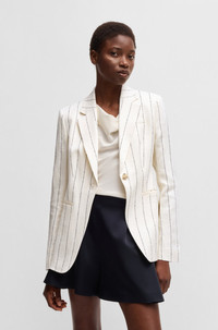 SIZE AND FIT The model wears a size 4 and is 5'10" tall with a, 31" chest, 24" waist and 35" hips. DETAILS Jia6 - 50537464 Cut to a streamlined fit with one button, this BOSS Womenswear suit jacket is a fresh formal option. Summery linen blend with vertical boucle stripes. Slim fit Notched lapels Fastening top: Button closure Number of buttons: 1 Welt chest pockets Pockets top: Welt pockets Back vent Fully lined Fit back length: 70 cm (28 inches) QUALITY & CARE INSTRUCTIONS Iron Low Heat Reduced Dry Clean Do Not Tumble Dry Quality: 66% Linen, 31% Viscose, 2% Elastane, 1% Polyester, Lining: 64% Viscose, 36% Polyester Do Not Wash Do Not Bleach