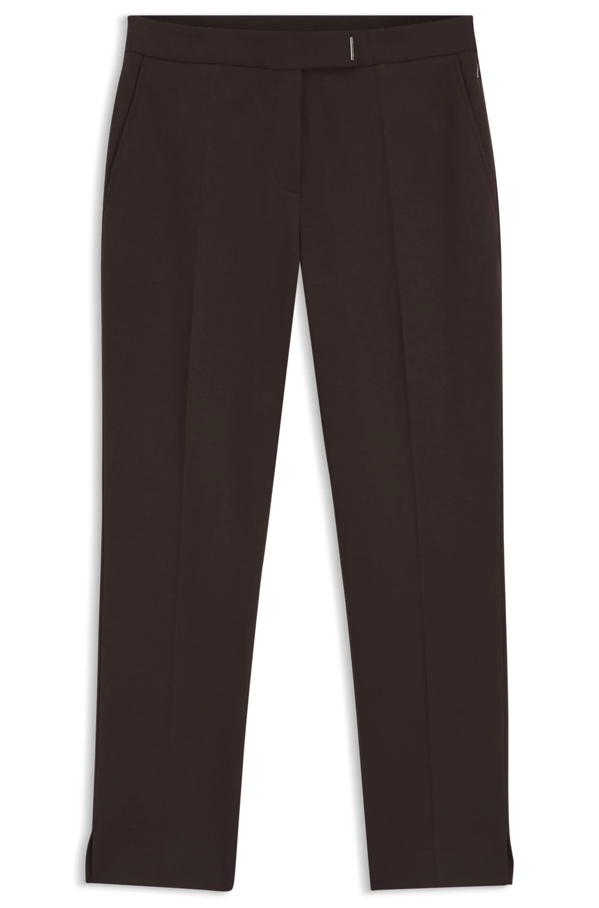 SIZE AND FIT Slim fit The model wears a size 4 and is 5'9" tall with a, 30" chest, 23" waist and 35" hips. DETAILS Cut to a slim fit in stretch jersey, these BOSS Womenswear trousers will keep you comfortable all day. Cropped length with slit hems. Metallic details. Slim fit Regular rise Button and zip closure Elastic Waistband Slim leg Pockets bottom front: French pocket Pockets bottom back: Welt pocket Fit foot width: 34,0 cm (13.4 inches) Tapria-Crop - 50556341 QUALITY & CARE INSTRUCTIONS Iron Low Heat Do Not Wash Do Not Bleach Reduced Dry Clean Material: 65% Viscose, 30% Polyamide, 5% Elastane, Waistband: 85% Polyester, 15% Polyurethane, pocketing: 64% Viscose, 36% Polyester Do Not Tumble Dry