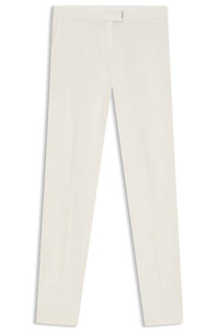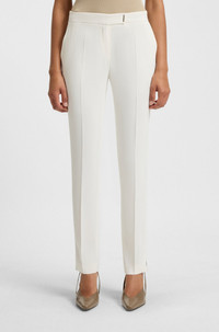 DETAILS Tapria - 50541990 Cut to a slim fit, these BOSS Womenswear trousers are made in soft crepe for comfort with a formal twist. Contemporary slits at the hems. Slim fit Regular rise Button and zip closure Elastic Waistband Slim leg Pockets bottom front: French pocket Pockets bottom back: Welt pocket QUALITY & CARE INSTRUCTIONS Do Not Tumble Dry Reduced Dry Clean Iron Low Heat Do Not Wash Do Not Bleach Quality: 100% Viscose, Waistband: 85% Polyester, 15% Polyurethane, pocketing: 55% Polyester, 45% Viscose