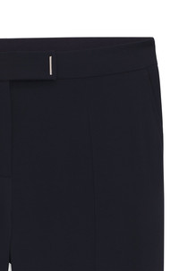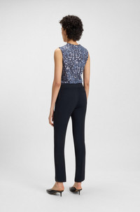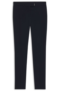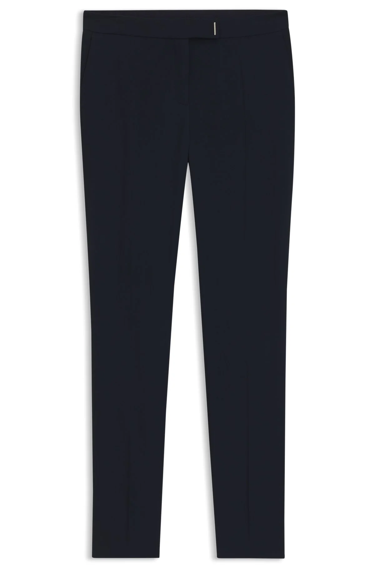 SIZE AND FIT The model wears a size 4 and is 5'10" tall with a, 31" chest, 24" waist and 35" hips. DETAILS Tapria - 50541990 Cut to a slim fit, these BOSS Womenswear trousers are made in soft crepe for comfort with a formal twist. Contemporary slits at the hems. Slim fit Regular rise Button and zip closure Elastic Waistband Slim leg Pockets bottom front: French pocket Pockets bottom back: Welt pocket QUALITY & CARE INSTRUCTIONS Do Not Tumble Dry Reduced Dry Clean Iron Low Heat Do Not Wash Do Not Bleach Quality: 100% Viscose, Waistband: 85% Polyester, 15% Polyurethane, pocketing: 55% Polyester, 45% Viscose