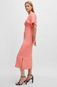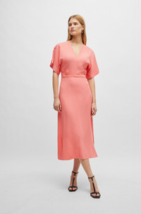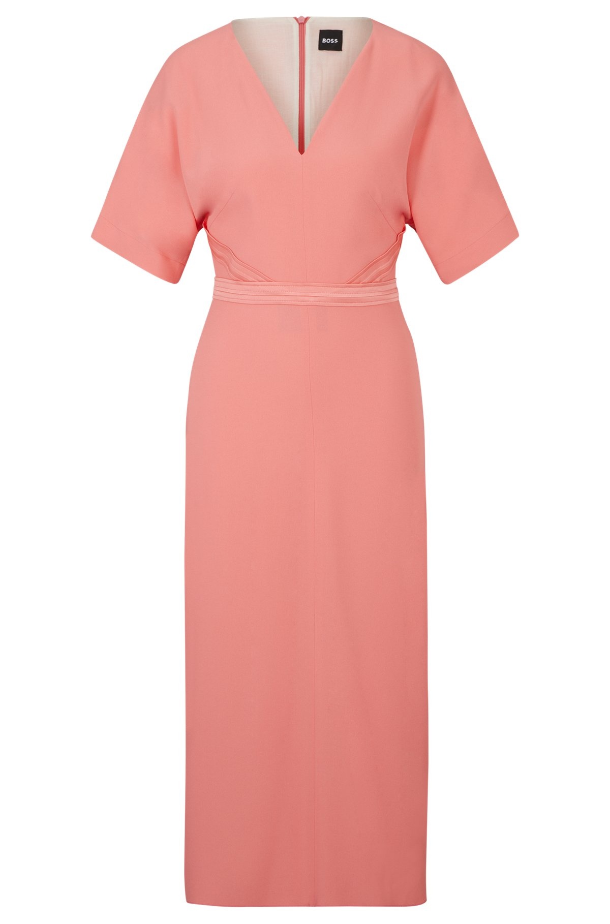 SIZE AND FIT The model wears a size 4 and is 5'10" tall with a, 34" chest, 24" waist and 35" hips. DETAILS Dawinga2 - 50512822 A feminine occasion dress by BOSS Womenswear, designed in fluent material with a V neckline, draped sleeves and stitching details at the waist. Fit back length: 123 cm (48 inches) QUALITY & CARE INSTRUCTIONS Reduced Dry Clean Do Not Bleach Do Not Tumble Dry Quality: 72% Acetate, 28% Viscose, Lining: 64% Viscose, 36% Polyester Do Not Wash Iron Low Heat