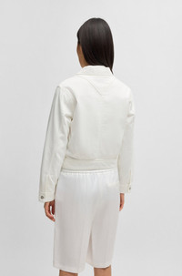 SIZE AND FIT The model wears a size S and is 5'10" tall with a, 31" chest, 23" waist and 35" hips. DETAILS This luxuriously soft BOSS Womenswear denim jacket is made in finest Egyptian cotton. With welt pockets for a tailored effect. Straight fit. SERENYA - 50538621 QUALITY & CARE INSTRUCTIONS Material: 100% Cotton, pocketing: 100% Cotton Iron Medium Heat Do Not Dry Clean Do Not Tumble Dry Do Not Bleach Machine Wash Cold Gentle