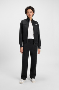 SIZE AND FIT The model wears a size S and is 5'10" tall with a, 31" chest, 24" waist and 35" hips. DETAILS Erina - 50544183 Featuring contrast piping and branding, these BOSS Womenswear tracksuit bottoms offer a classic sporty look. Cut to a straight fit in double-faced stretch fabric. Straight fit Pockets bottom front: Side pockets QUALITY & CARE INSTRUCTIONS Do Not Bleach Quality: 50% Polyester, 43% Cotton, 7% Elastane, Ribbing: 94% Polyester, 6% Elastane Do Not Tumble Dry Do Not Dry Clean Iron Low Heat Machine Wash Cold Gentle