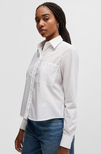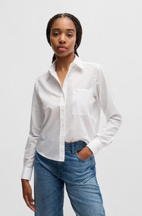 DETAILS Brielle_Monday - 50519413 A signature blouse by BOSS with an embroidered Double B monogram. This regular-fit piece is crafted in soft striped cotton. Regular fit Point collar Fastening top: Concealed closure Long sleeves Button cuffs Patch chest pockets Pockets top: Patch pockets Fit back length: 60 cm (24 inches) QUALITY & CARE INSTRUCTIONS Machine Wash Cold Do Not Iron Quality: 100% Cotton Do Not Bleach Do Not Tumble Dry Do Not Dry Clean