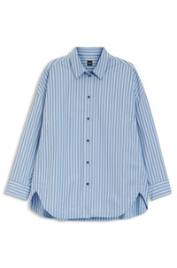 SIZE AND FIT Oversize fit The model wears a size 4 and is 5'10" tall with a, 33" chest, 23" waist and 34" hips. DETAILS Cut to an oversize fit, this BOSS Womenswear blouse has a classic stripe on paper-touch cotton poplin. Embroidered logo on cuff. Oversized fit Point collar Long sleeves Button cuffs C_Bostatta - 50559241 QUALITY & CARE INSTRUCTIONS Machine Wash Cold Iron Low Heat Material: 100% Cotton Do Not Bleach Do Not Tumble Dry Do Not Dry Clean
