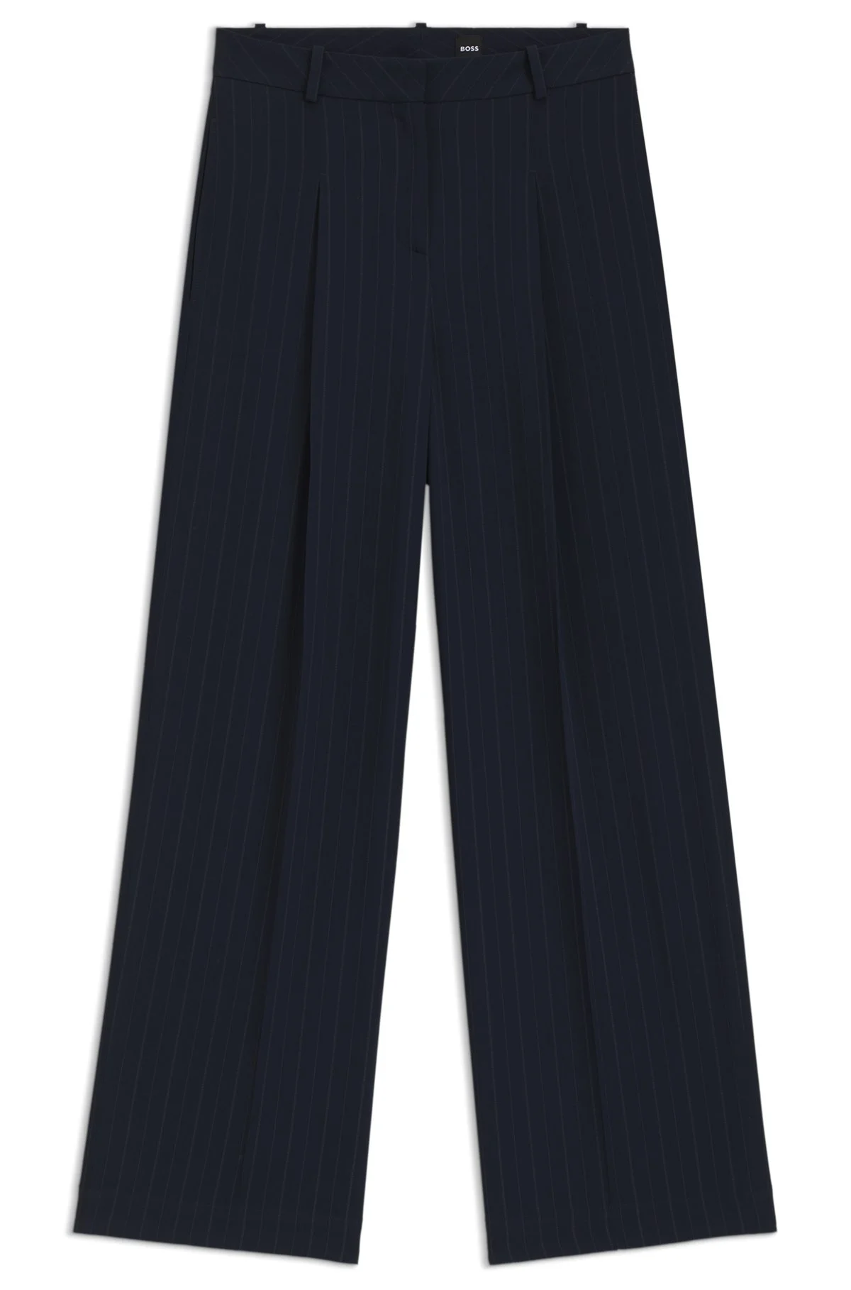 SIZE AND FIT The model wears a size 4 and is 5'11" tall with a, 31" chest, 23" waist and 34" hips. DETAILS Tiana4 - 50548479 With a long length and wide leg, these straight-cut BOSS Womenswear trousers strike a modern silhouette. Front pleats. Pinstripe print. Regular fit Regular rise Wide leg Fit foot width: 62,0 cm (24.4 inches) QUALITY & CARE INSTRUCTIONS Do Not Tumble Dry Reduced Dry Clean Iron Low Heat Do Not Wash Quality: 100% Viscose, pocketing: 55% Polyester, 45% Viscose Do Not Bleach