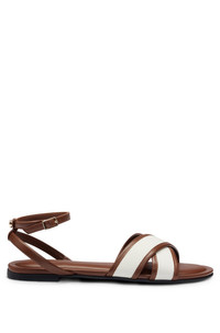 DETAILS Millie_Sandal_CVNA - 50517385 Strappy flat sandals with textured cotton canvas, smooth leather trims, a padded insole and a branded accent by BOSS. Fastening top: Buckle closure Fully lined Packaging: Box QUALITY & CARE INSTRUCTIONS Upper material: 100% Lamb leather, Lining: 100% Lamb leather, Sole: 100% Rubber, Facing: 100% Polyester, Innersole: 100% Lamb leather