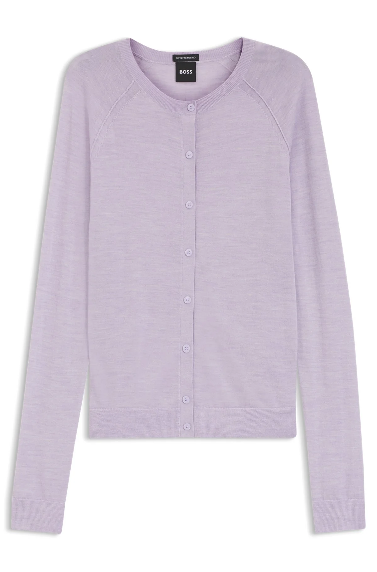 SIZE AND FIT The model wears a size S and is 5'9" tall with a, 30" chest, 23" waist and 35" hips. DETAILS A timeless BOSS Womenswear cardigan, crafted from exceptionally soft merino wool. Natural breathability, moisture management, and odor control for year-round comfort. Neckline: Crew neck Long sleeves Fit back length: 59 cm (23 inches) Fonami - 50545031 QUALITY & CARE INSTRUCTIONS Reduced Dry Clean Do Not Bleach Do Not Tumble Dry Material: 100% Virgin wool Hand Wash Only Iron Low Heat