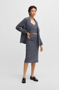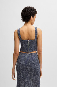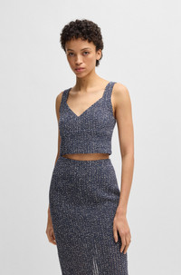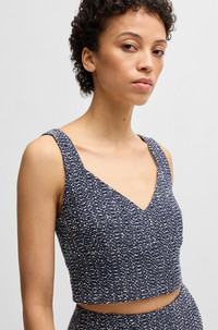 SIZE AND FIT The model wears a size 4 and is 5'10" tall with a, 31" chest, 24" waist and 35" hips. DETAILS Balitar - 50537942 Crocheted in two-tone tweed, this V-neck BOSS Womenswear top is a fresh update for your collection. Blended with cotton for comfort. Flattering fitted silhouette. Fit back length: 41 cm (16 inches) QUALITY & CARE INSTRUCTIONS Do Not Bleach Iron Low Heat Reduced Dry Clean Do Not Tumble Dry Quality: 50% Cotton, 38% Polyester, 7% Polyurethane, 5% Other fibres, Lining: 100% Viscose Do Not Wash