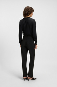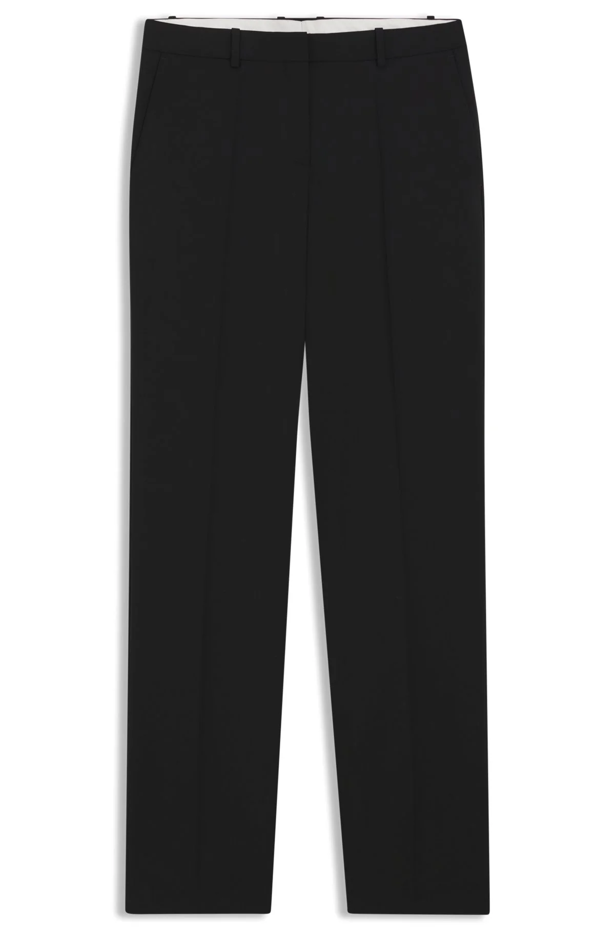 SIZE AND FIT The model wears a size 2 and is 5'9" tall with a, 31" chest, 24" waist and 35" hips. DETAILS Tameah - 50490045 Create elegant looks to take you from desk to dinner with these straight-leg trousers by BOSS Womenswear. Italian virgin wool. Regular fit High waist. Regular fit High rise Hook and zip closure Straight leg Crease Pockets bottom front: French pocket Pockets bottom back: Welt pocket Fit foot width: 38,0 cm (15.0 inches) QUALITY & CARE INSTRUCTIONS Iron Low Heat Do Not Wash Quality: 100% Virgin wool, pocketing: 100% Cotton Reduced Dry Clean Do Not Bleach Do Not Tumble Dry