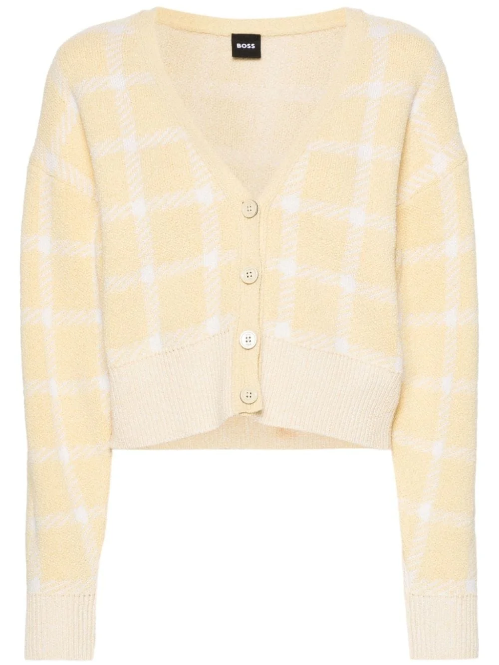 tartan knitted cardigan Highlights - Butter yellow/white - Cotton-virgin wool blend - Tartan check pattern - V-neck - Drop shoulder - Long sleeves - Ribbed cuffs and hem - Silver-tone logo plaque to the rear - Internal logo tag - Straight hem - Front button fastening Imported Composition Cotton 45%, Virgin Wool 28%, Polyamide 24%, Polyester 2%, Elastane 1% SIZE & FIT Model measurements Height 5 ft 10 in(1.77 m) Bust/Chest 33.85 in(86 cm) Hips 37 in(94 cm) Waist 26.37 in(67 cm) FittingInformation Designed for a relaxed fit, this piece allows for comfort and movement when worn Made with a midweight knit, this piece offers some stretch This piece fits true to size – take your usual size