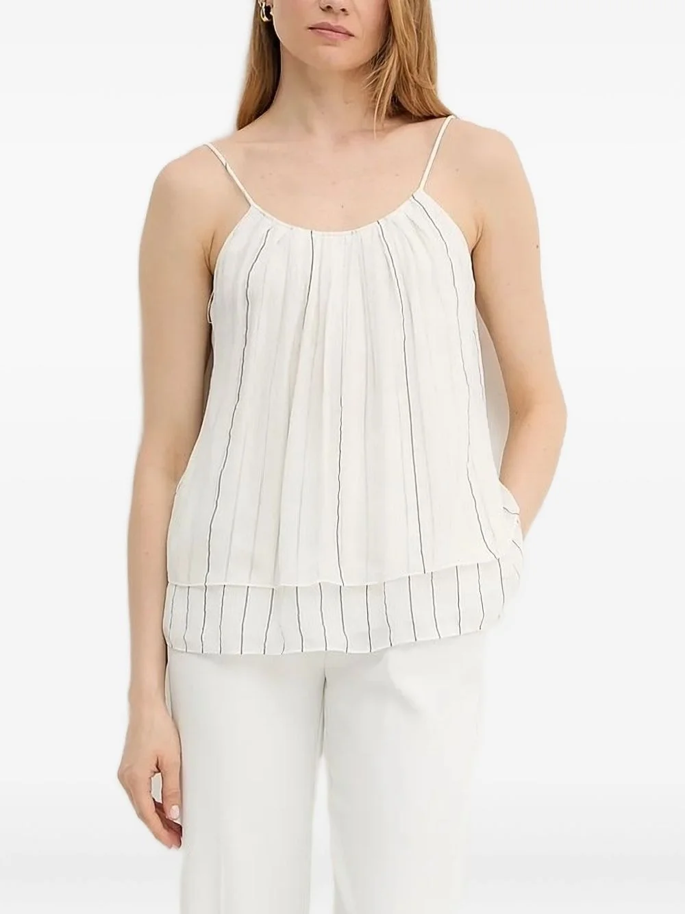tie-back horizontal-stripes blouse Highlights - Off-white - Tie fastening - Layered design - Sleeveless - Open back Imported Composition Viscose 63%, Silk 35%, Polyester 2% Washing instructions Read Manufacturer Guidelines