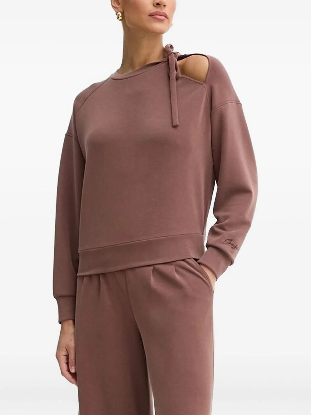 tie-detail cut-out sweater Highlights - Brown - Dropped shoulder - Tie fastening - Raglan sleeves - Round neck Imported Composition Polyester 48%, Modal 44%, Elastane 8% Washing instructions Read Manufacturer Guidelines