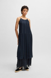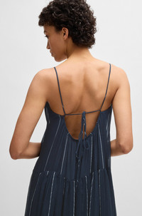 SIZE AND FIT The model wears a size 4 and is 5'10" tall with a, 31" chest, 24" waist and 35" hips. DETAILS Davala - 50535154 Tying at the back for an elegant look, this BOSS Womenswear dress delivers effortless summer style. The soft fabric is blended with silk for a luxurious feel and a fluid drape, while tiering and layering create floaty movement. A modern vertical stripe adds a sophisticated finish. Relaxed fit Sleeveless Partially lined Fit back length: 137 cm (54 inches) QUALITY & CARE INSTRUCTIONS Quality: 63% Viscose, 35% Silk, 2% Polyester, Lining: 100% Viscose, Insert: 61% Viscose, 33% Silk, 6% Polyester Do Not Tumble Dry Do Not Bleach Do Not Wash Iron Low Heat Reduced Dry Clean