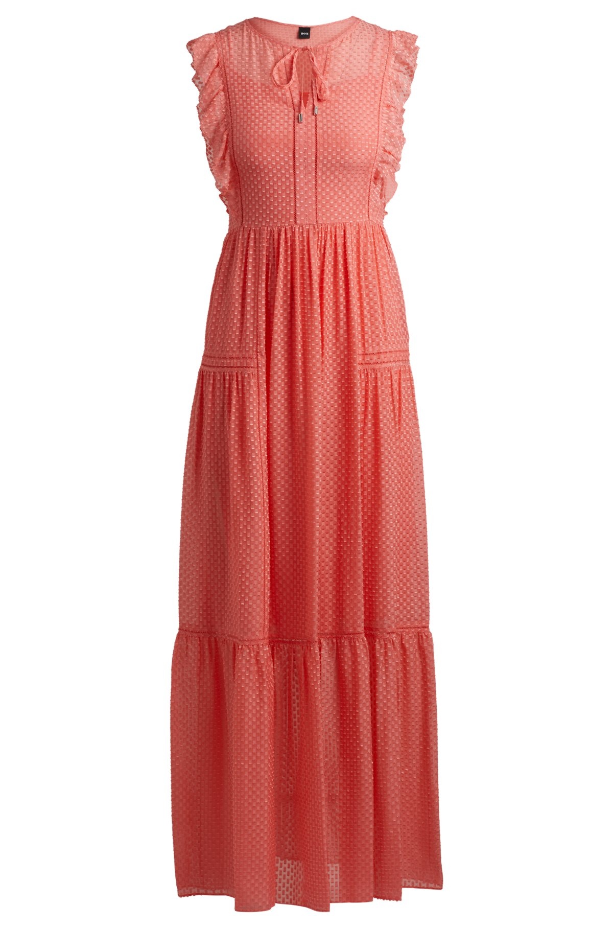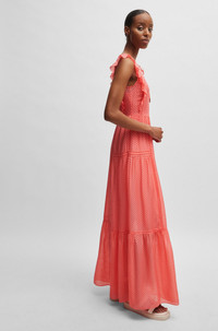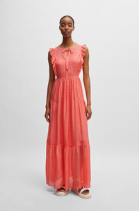 SIZE AND FIT The model wears a size 2 and is 5'9" tall with a, 30" chest, 22" waist and 36" hips. DETAILS Dacrina - 50514718 A sleeveless dress blended with silk by BOSS Womenswear, featuring frill trims and an adjustable tie at the neckline. Fit back length: 145 cm (57 inches) QUALITY & CARE INSTRUCTIONS Reduced Dry Clean Do Not Bleach Do Not Tumble Dry Quality: 70% Viscose, 30% Silk, Lining: 100% Viscose Do Not Wash Iron Low Heat