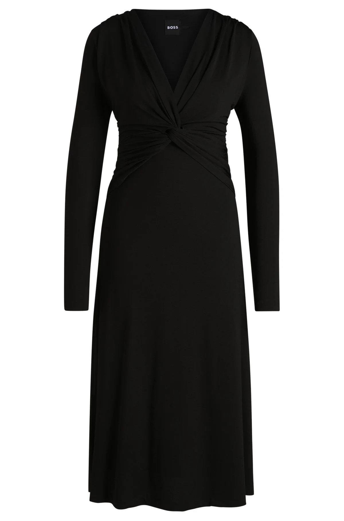 SIZE AND FIT The model wears a size S and is 5'11" tall with a, 31" chest, 23" waist and 34" hips. DETAILS Eulo - 50532019 A V-neck dress by BOSS Womenswear. Crafted in stretch crepe with a twist front, this versatile piece can be simply styled to suit any occasion. QUALITY & CARE INSTRUCTIONS Reduced Dry Clean Do Not Bleach Cold, gentle machine wash; reduced spin speed. Do Not Tumble Dry Quality: 91% Viscose, 9% Elastane, Lining: 86% Polyamid, 14% Elastane Iron Low Heat