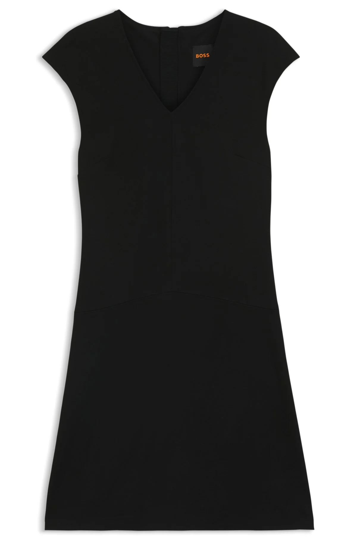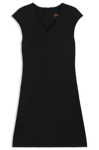SIZE AND FIT The model wears a size S and is 5'10" tall with a, 31" chest, 24" waist and 35" hips. DETAILS C_Duttina - 50543845 With stitched-down cutlines delivering a flattering effect, this BOSS Womenswear dress is a versatile daytime option. A-line profile in stretch fabric. Rear zip. Slim fit Neckline: V-neck Fastening top: Zip closure Cap sleeves Unlined Fit back length: 90 cm (35 inches) QUALITY & CARE INSTRUCTIONS Do Not Tumble Dry Iron Medium Heat Do Not Wash Do Not Bleach Quality: 70% Viscose, 26% Polyamid, 4% Elastane Dry Clean Only
