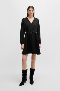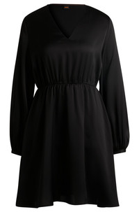 SIZE AND FIT The model wears a size S and is 5'10" tall with a, 31" chest, 24" waist and 35" hips. DETAILS C_Doria - 50536240 An A-line dress, crafted in soft hammered satin, by BOSS Womenswear. This lightweight design features a V neckline, an elasticated waist and voluminous sleeves. Regular fit Neckline: V-neck Long sleeves Button cuffs QUALITY & CARE INSTRUCTIONS Do Not Bleach Do Not Tumble Dry Machine Wash Cold Do Not Dry Clean Iron Low Heat Quality: 100% Polyester