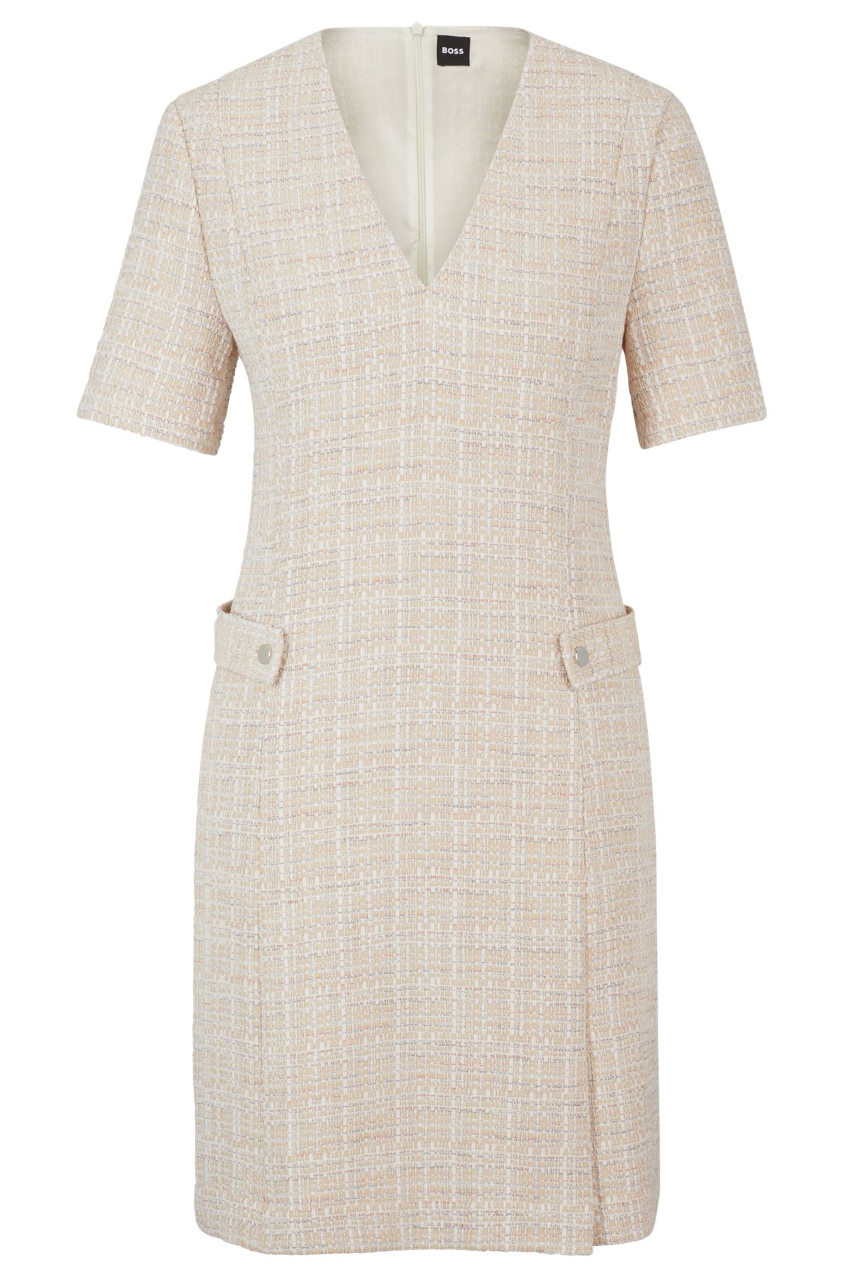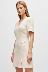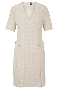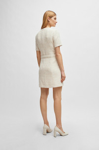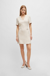 SIZE AND FIT The model wears a size 4 and is 5'10" tall with a, 34" chest, 24" waist and 35" hips. DETAILS Destena2 - 50515195 A modern business dress by BOSS Womenswear. Styled with a V neckline and smooth signature lining, this dress is crafted in melange tweed blended with cotton. The waistband features a decorative belt with hardware buttons. Fit back length: 89 cm (35 inches) QUALITY & CARE INSTRUCTIONS Iron Low Heat Do Not Wash Reduced Dry Clean Do Not Bleach Do Not Tumble Dry Quality: 51% Polyester, 39% Cotton, 10% Polyacrylic, Lining: 64% Viscose, 36% Polyester