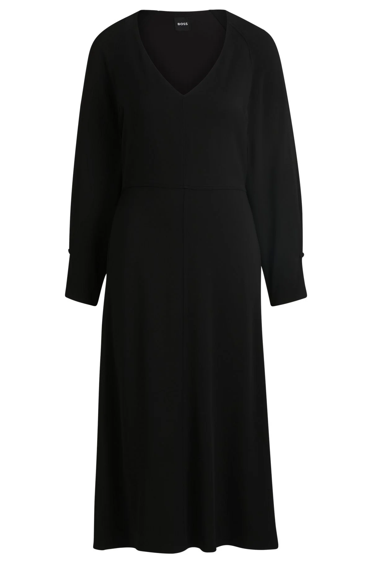 SIZE AND FIT The model wears a size 4 and is 5'10" tall with a, 31" chest, 24" waist and 35" hips. DETAILS Diesha1 - 50533966 A relaxed-fit slip-on dress by BOSS Womenswear. This easy-wear piece has a V neckline and buttoned cuffs for an elegant finish. Relaxed fit Neckline: V-neck Fastening top: Slip-on No cuffs Partially lined QUALITY & CARE INSTRUCTIONS Do Not Tumble Dry Do Not Bleach Do Not Wash Reduced Dry Clean Iron Low Heat Quality: 96% Viscose, 4% Elastane, Lining: 100% Viscose