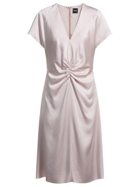 DETAILS Dulania - 50537964 This BOSS Womenswear dress creates effortless formal looks. The soft twill has a lustrous finish, while the waistband is gathered at the center for a flattering effect. A deep V neckline and hidden rear zip round off this piece. Regular fit Neckline: V-neck Short sleeves Crease Fit back length: 105 cm (41 inches) QUALITY & CARE INSTRUCTIONS Do Not Tumble Dry Quality: 72% Acetate, 28% Viscose, Lining: 64% Viscose, 36% Polyester Iron Low Heat Do Not Bleach Reduced Dry Clean Do Not Wash