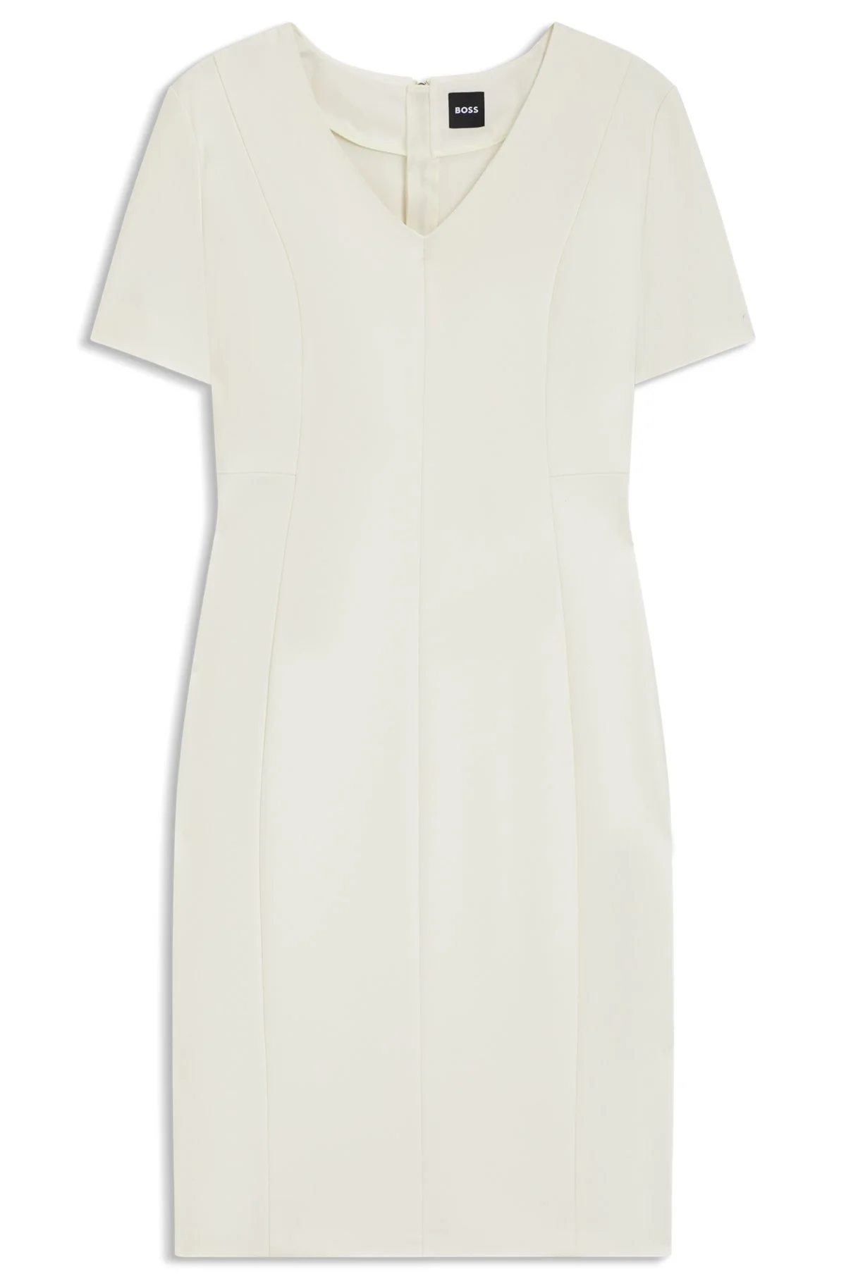 SIZE AND FIT The model wears a size 2 and is 5'9" tall with a, 31" chest, 24" waist and 35" hips. DETAILS Damaisa - 50490044 A business essential for enduring style, this BOSS Womenswear dress is crafted with stretch for comfort and a flattering fit. Travel-friendly crease-resistant fabric. Slim fit Neckline: V-neck Fastening top: Zip closure Short sleeves Back slit Unlined Fit back length: 100 cm (39 inches) QUALITY & CARE INSTRUCTIONS Cold, gentle machine wash; reduced spin speed. Do Not Tumble Dry Quality: 67% Viscose, 29% Polyester, 4% Elastane, Facing: 100% Cotton Do Not Bleach Iron Low Heat Reduced Dry Clean