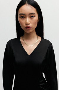 SIZE AND FIT The model wears a size 4 and is 5'9" tall with a, 30" chest, 23" waist and 35" hips. DETAILS Daniki - 50505634 A regular-fit dress crafted in soft satin with a V neckline and flattering gathered details by BOSS Womenswear. Regular fit Neckline: V-neck Fastening top: Zip closure Long sleeves Slit cuffs Fit back length: 125 cm (49 inches) QUALITY & CARE INSTRUCTIONS Do Not Tumble Dry Quality: 72% Acetate, 28% Viscose Do Not Bleach Do Not Wash Iron Low Heat Reduced Dry Clean