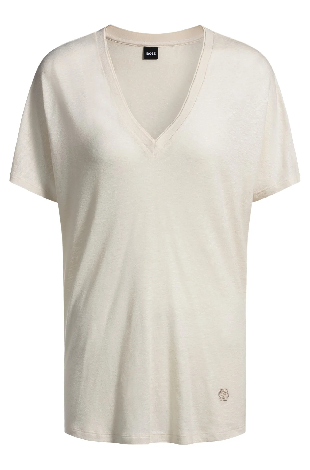 DETAILS Eylina - 50537543 A versatile option on summer days, this BOSS Womenswear T-shirt is blended with cooling linen. Embroidered with a small monogram detail. Regular fit Neckline: V-neck Short sleeves Fit back length: 64 cm (25 inches) QUALITY & CARE INSTRUCTIONS Cold, gentle machine wash; reduced spin speed. Do Not Tumble Dry Do Not Bleach Do Not Dry Clean Quality: 55% Viscose, 45% Linen Iron Low Heat
