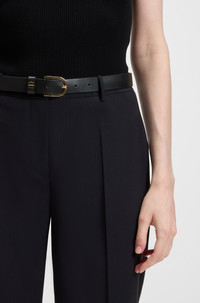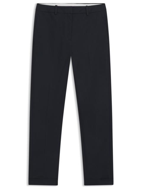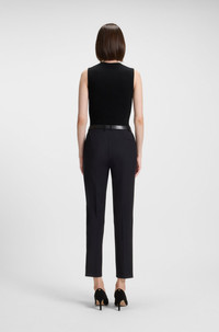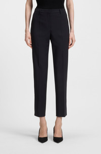 SIZE AND FIT The model wears a size 4 and is 5'8" tall with a, 30" chest, 23" waist and 35" hips. DETAILS Tilunah - 50490051 These elegantly tailored trousers by BOSS can be styled for day or night. Italian virgin wool with a high-rise waist and cropped, tapered leg. Regular fit High rise Hook and zip closure Tapered leg Crease Pockets bottom back: Welt pocket Fit foot width: 32,0 cm (12.6 inches) QUALITY & CARE INSTRUCTIONS Quality: 100% Virgin wool, pocketing: 100% Cotton Do Not Tumble Dry Do Not Bleach Do Not Wash Iron Low Heat Reduced Dry Clean