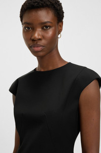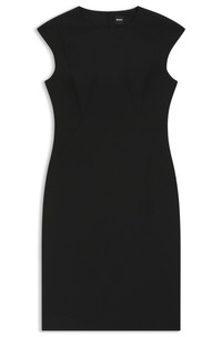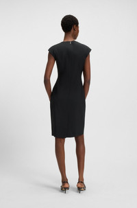 SIZE AND FIT The model wears a size 4 and is 5'10" tall with a, 34" chest, 24" waist and 35" hips. DETAILS Dironah - 50507578 A slim-fitting business dress with cap sleeves by BOSS Womenswear. This distinctive design is crafted in rich virgin wool with smooth lining. Slim fit Neckline: Scoop neck Fastening top: Zip closure Cap sleeves Back vent Fully lined QUALITY & CARE INSTRUCTIONS Reduced Dry Clean Do Not Bleach Quality: 100% Virgin wool, Lining: 64% Viscose, 36% Polyester Do Not Tumble Dry Do Not Wash Iron Low Heat