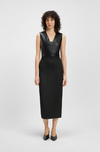 SIZE AND FIT The model wears a size 4 and is 5'10" tall with a, 31" chest, 24" waist and 34" hips. DETAILS Drumialda - 50543504 Mixing virgin-wool twill with soft leather, this sleeveless BOSS Womenswear dress cuts an elegant silhouette. Rear slit. V neckline. Seaming details. Slim fit Neckline: V-neck Fastening top: Zip closure Sleeveless Back slit Fully lined Fit back length: 130 cm (51 inches) QUALITY & CARE INSTRUCTIONS Do Not Wash Do Not Bleach Iron Medium Heat Reduced Dry Clean Do Not Tumble Dry Quality: 100% Virgin wool, Lining: 100% Polyester, Top: 100% Lamb leather
