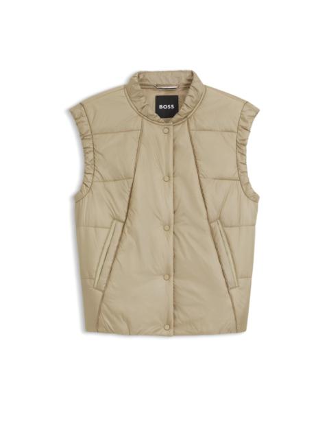 SIZE AND FIT The model wears a size 4 and is 5'9" tall with a, 32" chest, 23" waist and 35" hips. DETAILS Featuring wadding with sleek front paneling, this regular-fit BOSS Womenswear gilet will warm your core in style. Water-repellent finish. Regular fit Stand collar Fastening top: Press-stud closure Number of buttons: 4 or more buttons Pockets top: Welt pockets Standard length Fit back length: 55 cm (22 inches) Pia - 50551835 QUALITY & CARE INSTRUCTIONS Iron Low Heat Do Not Bleach Machine Wash Cold Gentle Tumble Dry Low Heat Do Not Dry Clean Material: 100% Polyamide, Lining: 100% Polyamide, Wadding: 100% Polyester