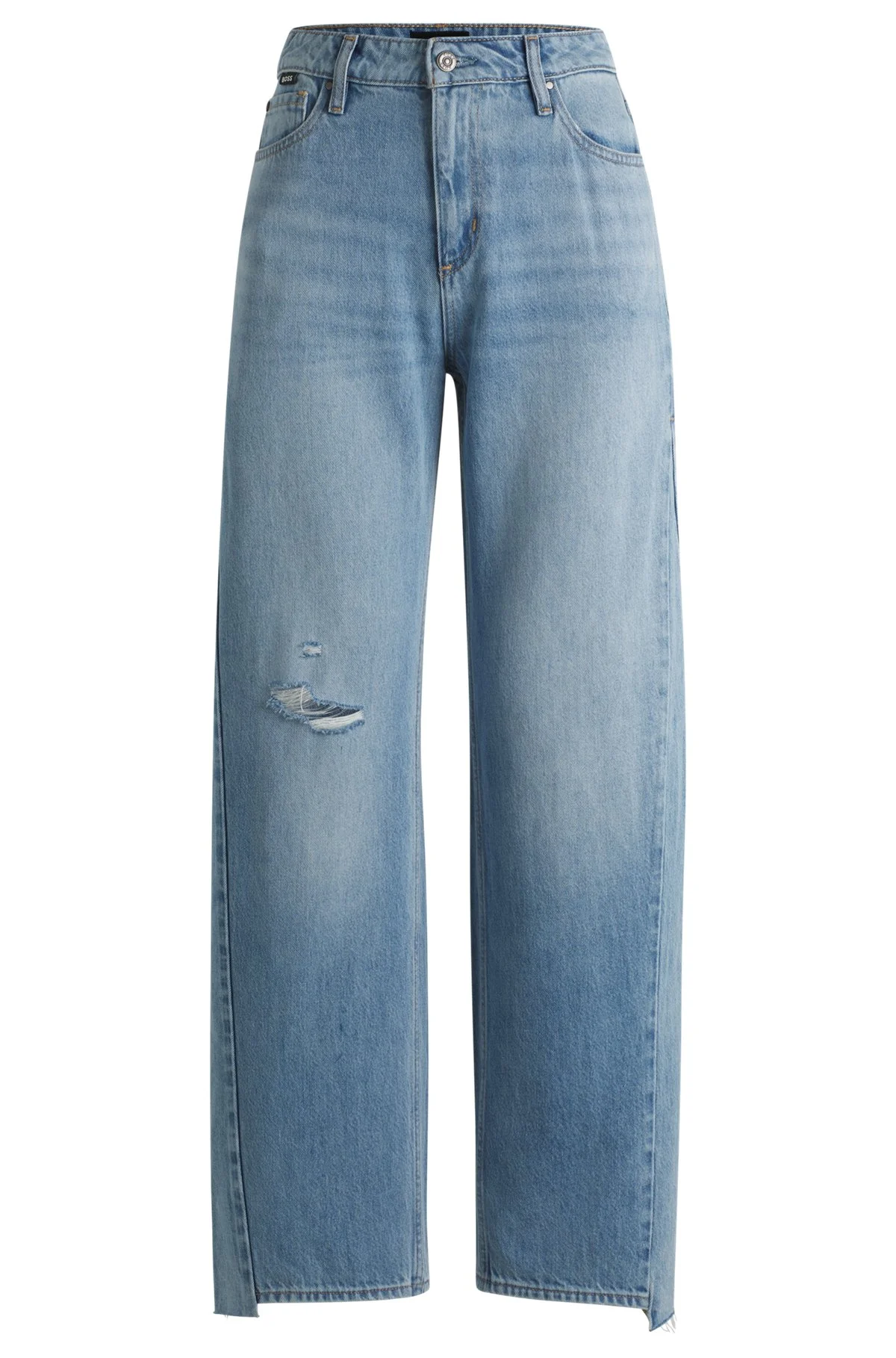 SIZE AND FIT The model wears a size 27/32 and is 5'9" tall with a, 31" chest, 24" waist and 35" hips. DETAILS CROSSROAD SUPER BF - 50536589 In light-blue distressed denim, these wide-leg BOSS Womenswear jeans are a modern update for your casual collection. Stepped hem for a contemporary silhouette. QUALITY & CARE INSTRUCTIONS Quality: 64% Cotton, 36% Lyocell, pocketing: 100% Cotton Iron Medium Heat Do Not Tumble Dry Do Not Bleach Machine Wash Cold Gentle Do Not Dry Clean